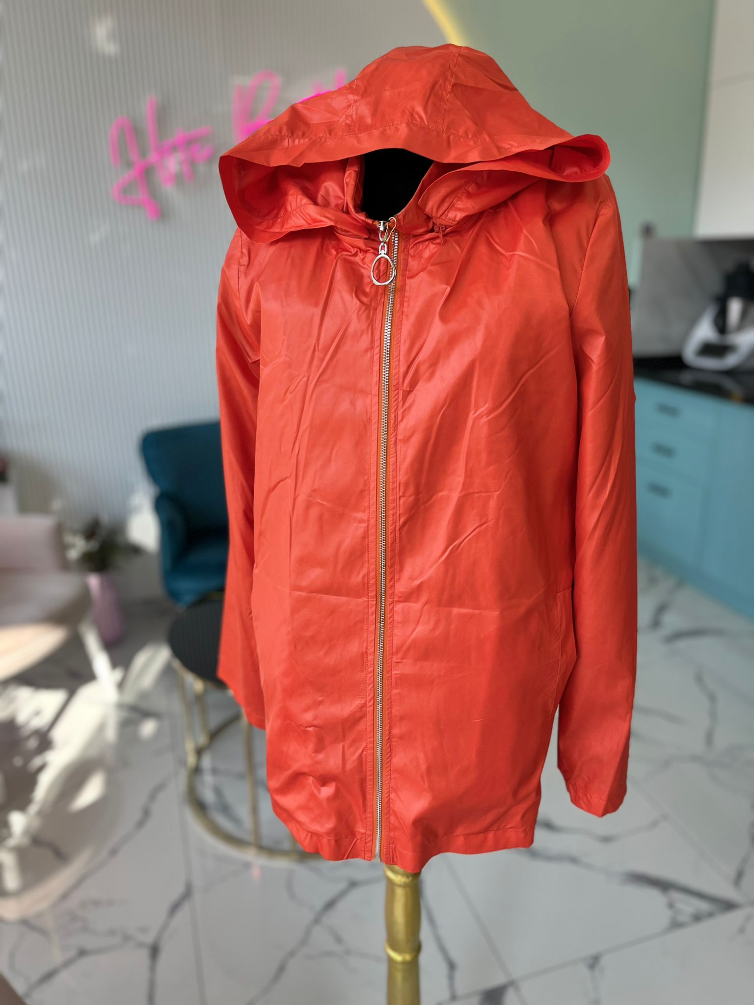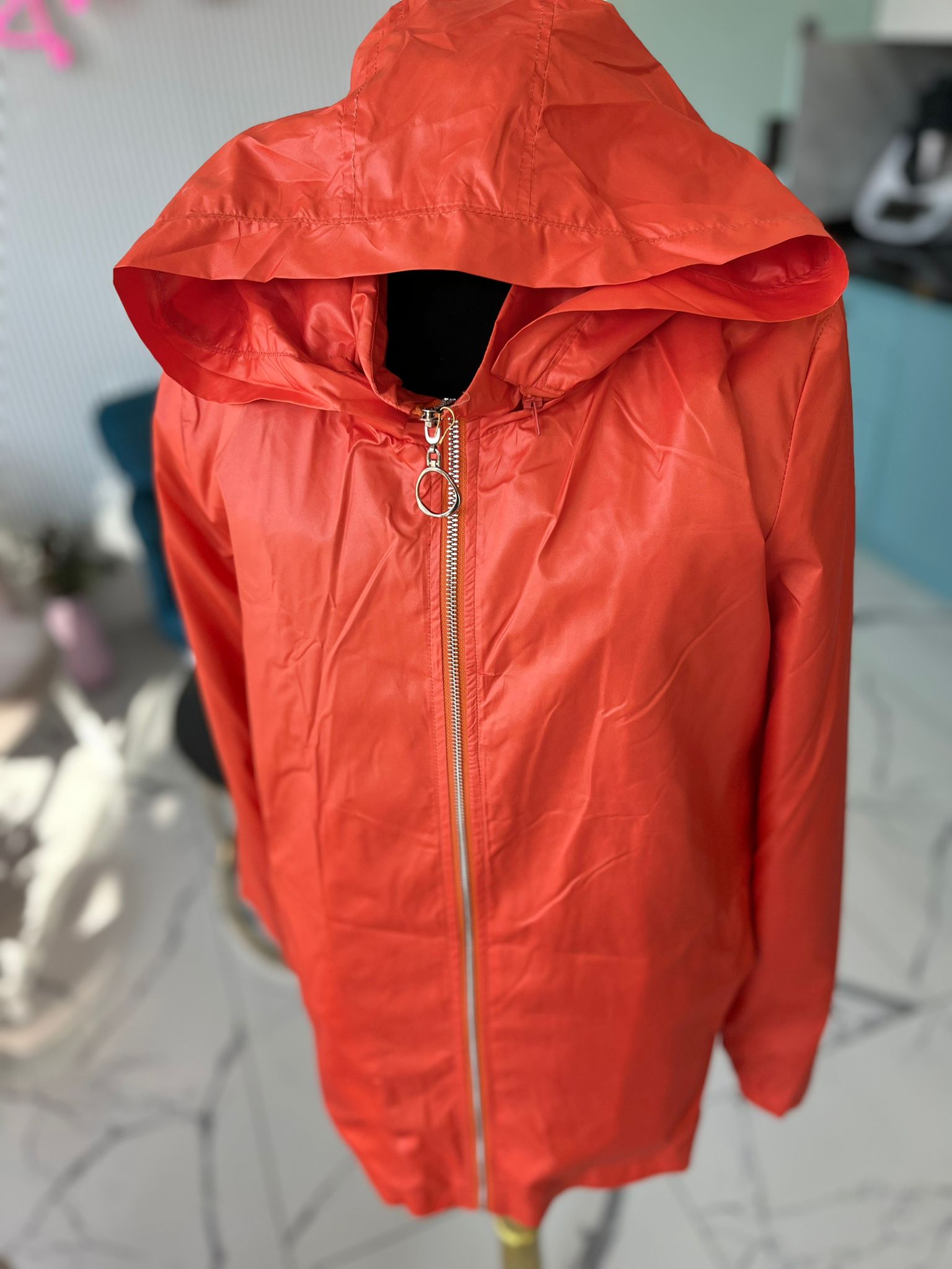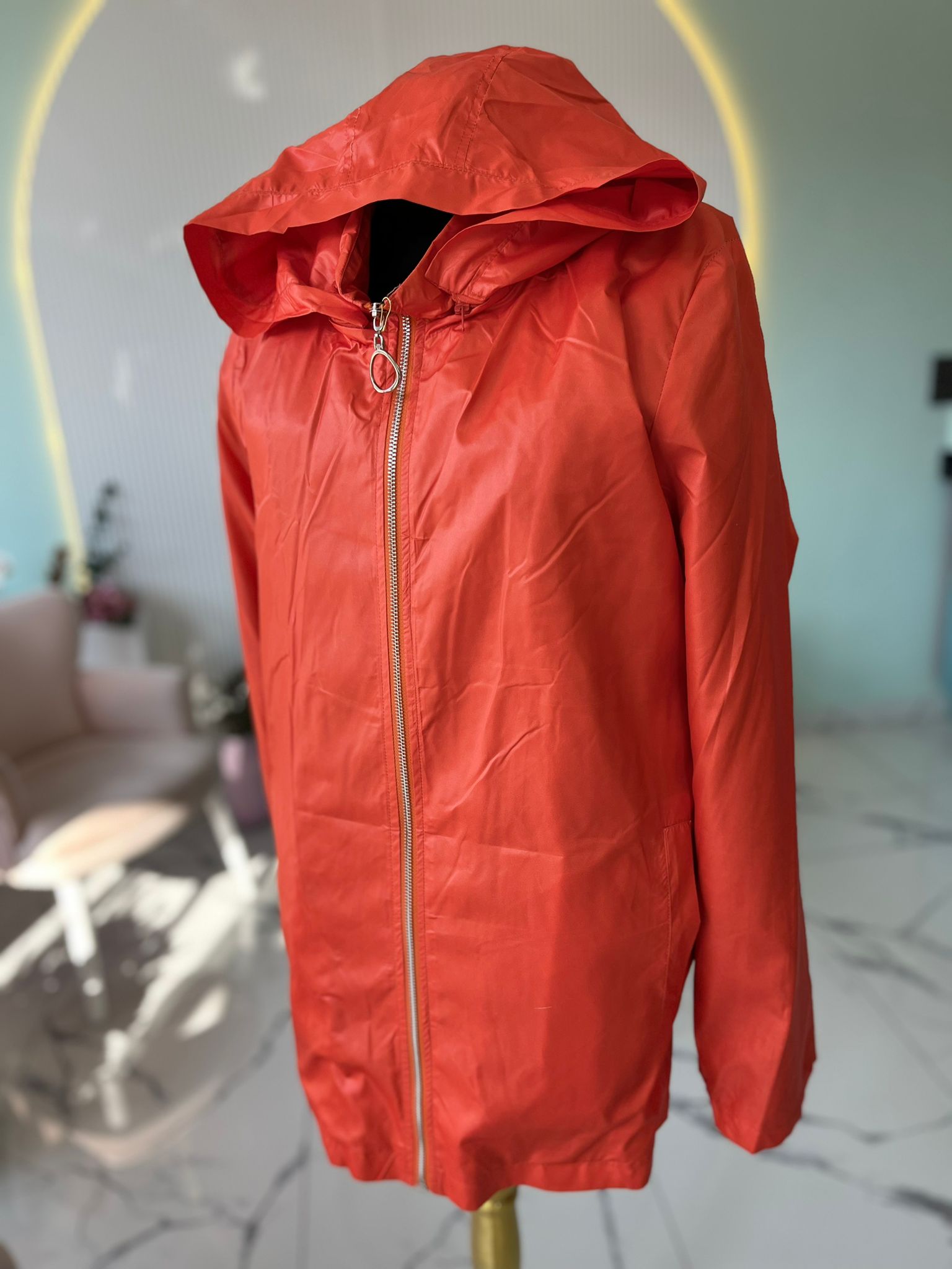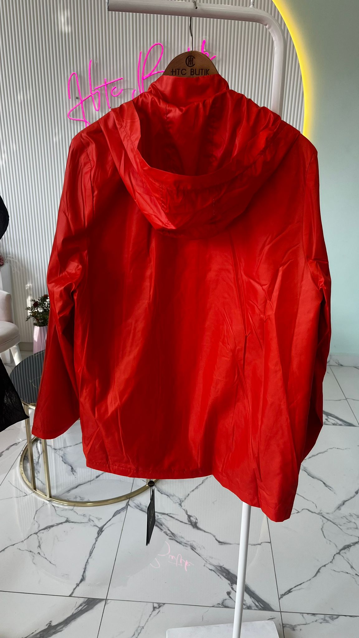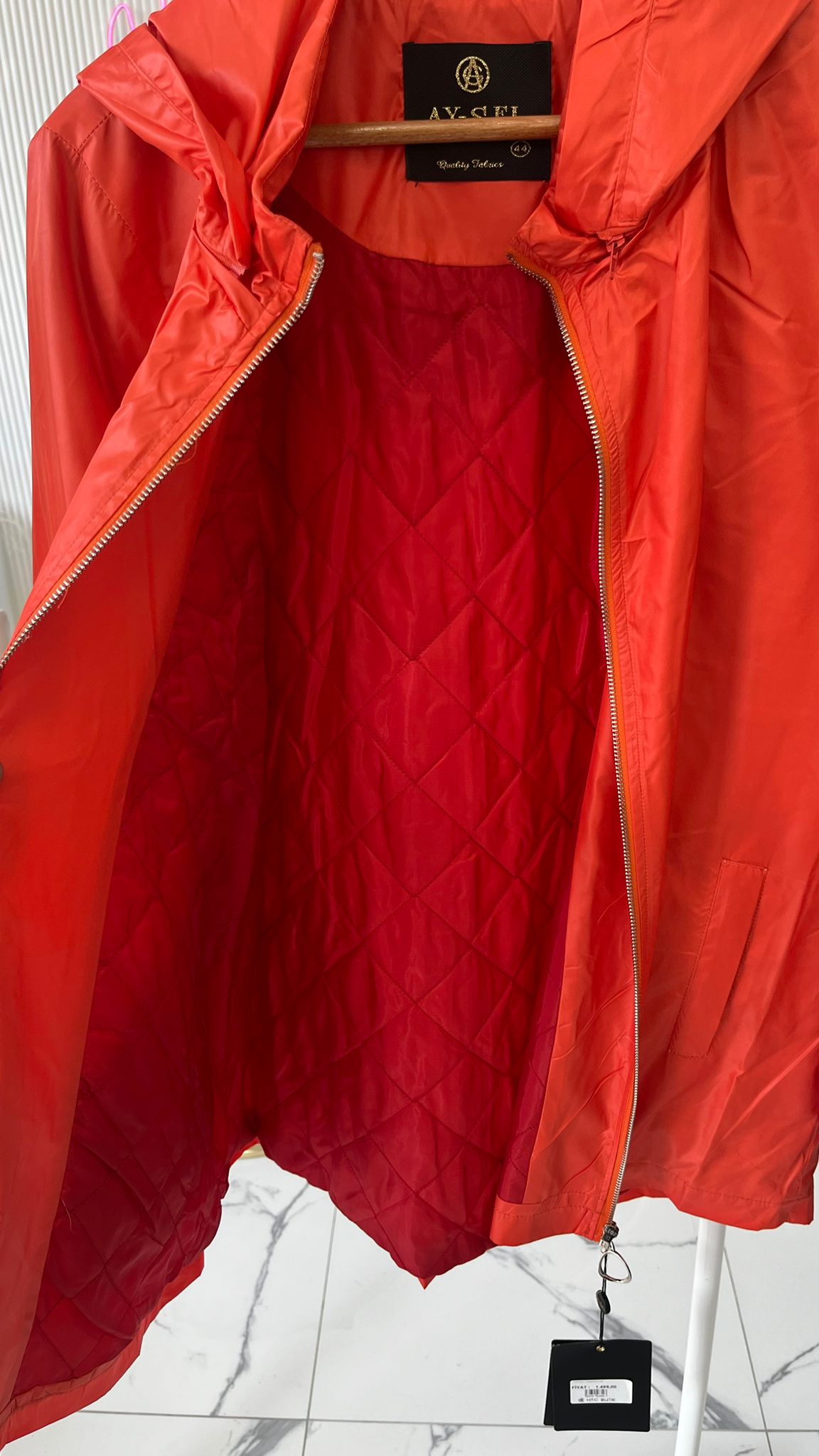 Kapşonludur ve kapşon naylona bağlı çıkarılabılr fermuarlıdır.